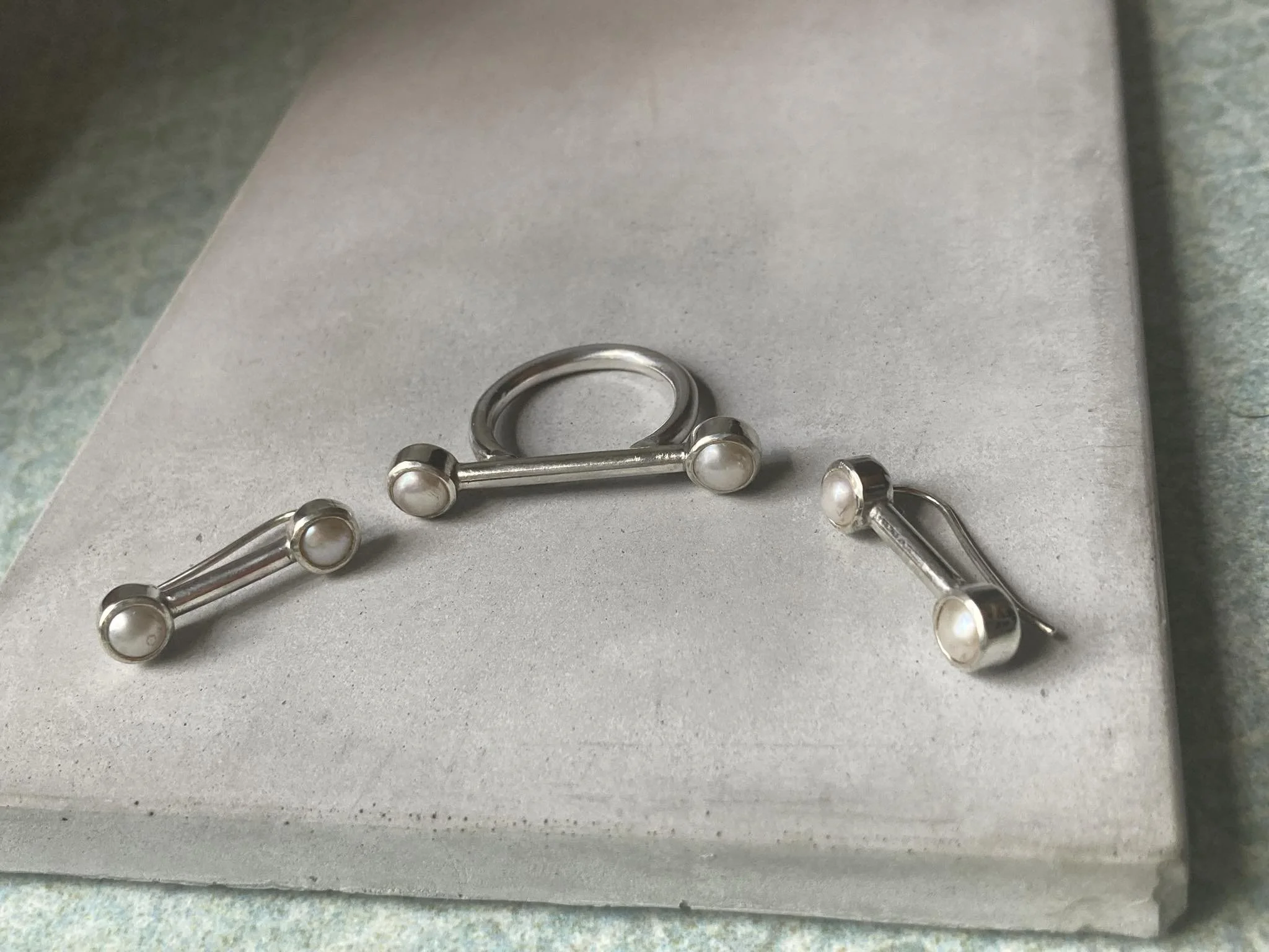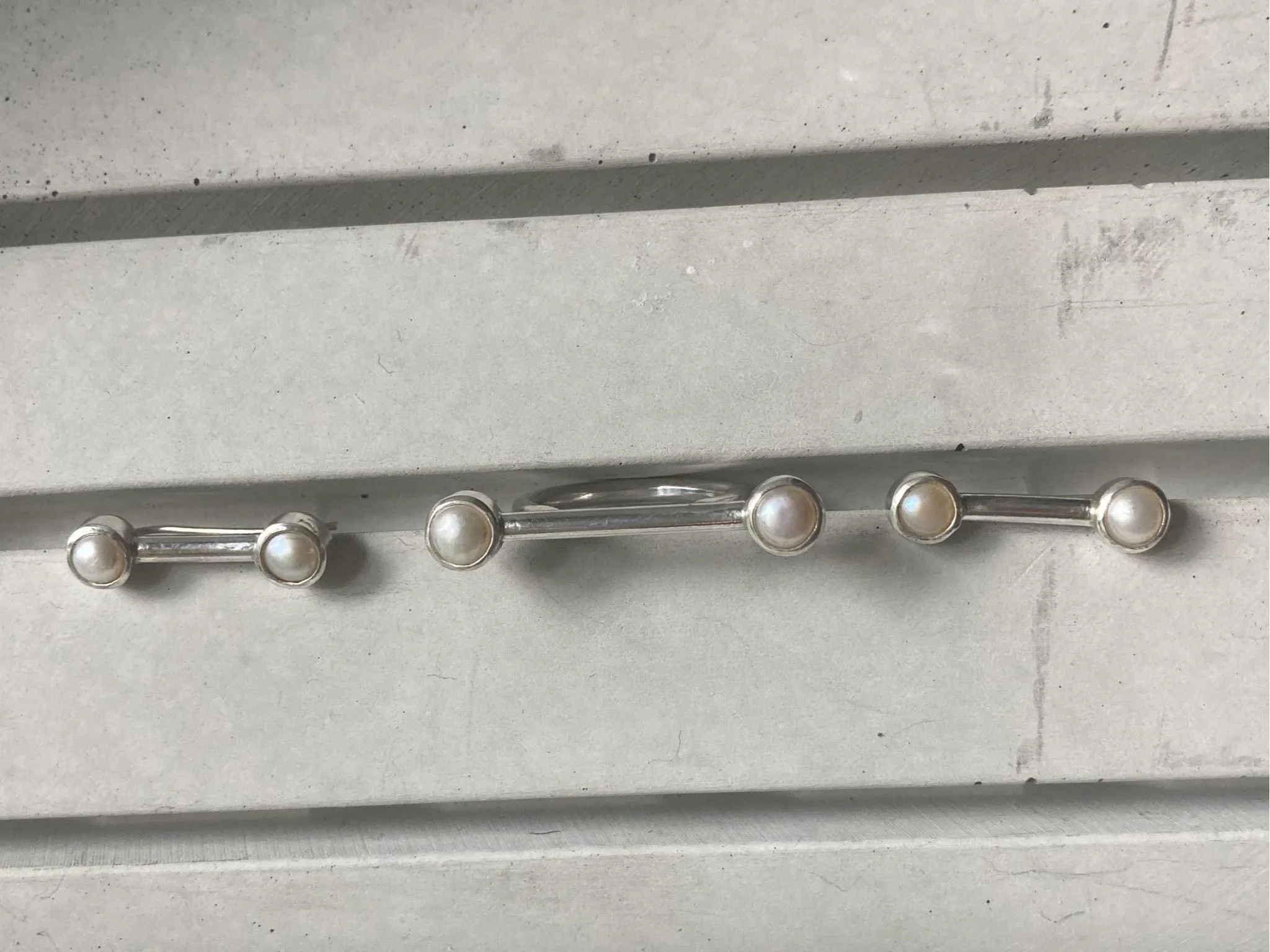 Sterling silver earrings with two cultured pearls. Ear climber earrings that sit elegantly up the ears. These were a prototype for a design that never made it into my collection. Some minor imperfections mirrored in the bargain price. 23mm long